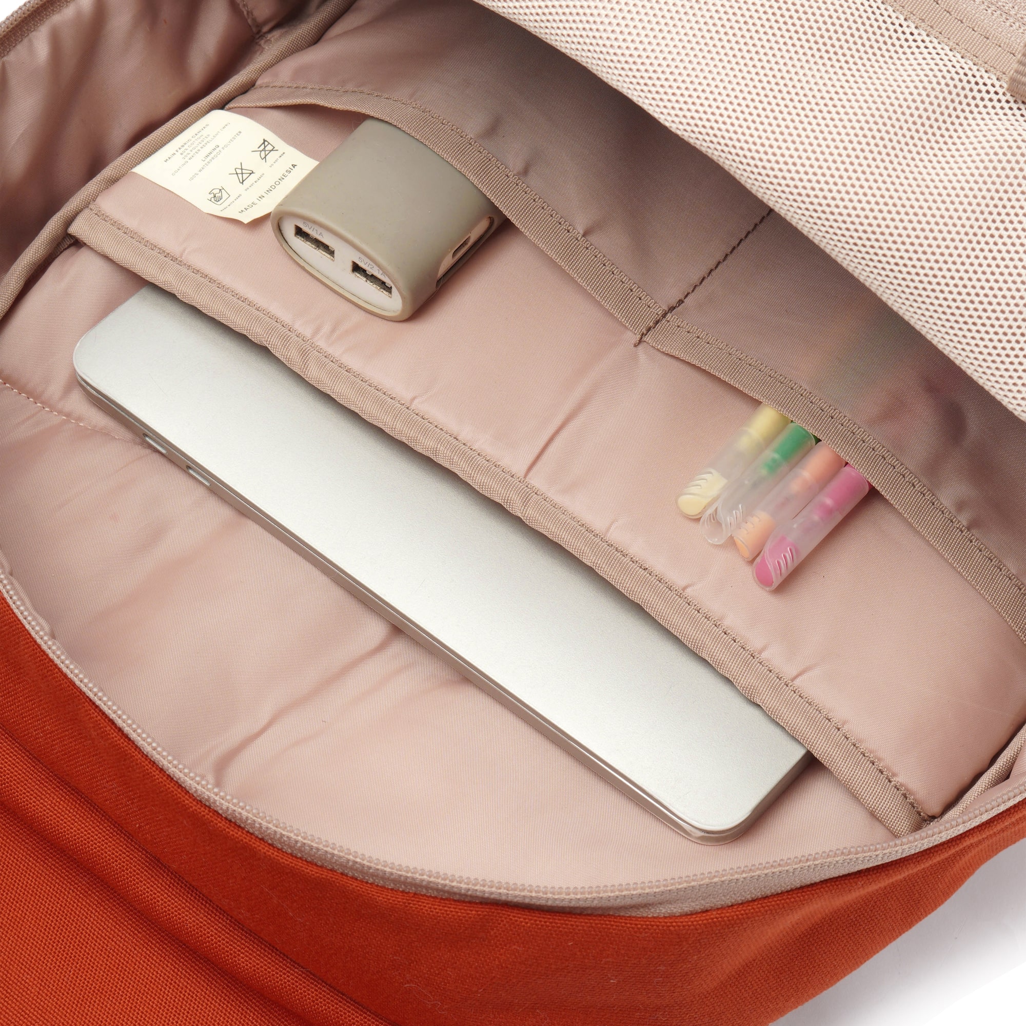 Backpack ini memiliki 1 kompartemen utama yang dilengkapi laptop sleeve up to 14 inch, 2 sleeve tambahan dan 1 net pocket untuk menyimpan barang-barang kecil dan 1 buckle/hook untuk akses dan penyimpanan kunci yang lebih mudah. Bagian depan dilengkapi 1 kompartemen tambahan dengan zipper dan 1 ekstra kompartemen dengan zipper pada bagian flap untuk akses cepat pada barang-barang essential, serta dilengkapi side sleeve untuk menyimpan tumbler atau botol minum.